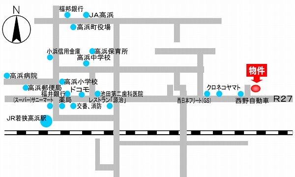 サニーマート 1930m、 ファミリーマート 940m、 コメリ 1490m、 高浜中学校 1460m、 和田小学校 1290m、 高浜小学校 1690m、 高浜病院 1890m、 和田郵便局 1060m、 高浜郵便局 1840m、 小浜信用金庫 1130m、 高浜町役場 1580m、 高浜分署 1690m