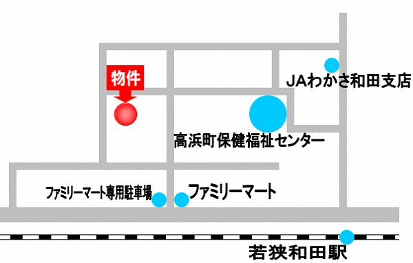 ファミリーマート 80m、 高浜中学校 2310m、 和田小学校 410m、 和田郵便局 310m、 小浜信用金庫 210m