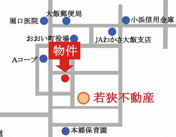 大飯中学校 2190m、 本郷小学校 930m、 本郷保育園 410m、 大飯幼稚園 830m、 大飯郵便局 330m、 小浜信用金庫 340m、 福井銀行 360m、 大飯町役場 210m